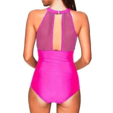 Tempt Me Women One Piece Swimsuits Hot Pink High Neck V-Neckline Mesh Ruch Swimwear L