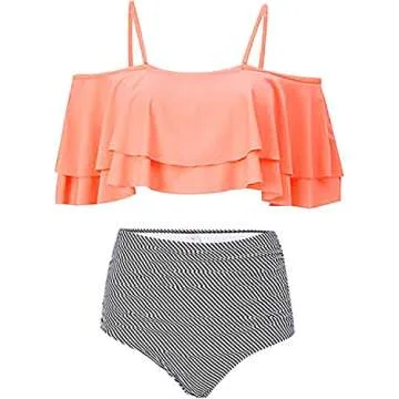 Tempt Me Women Pink Two Piece High Waisted Bikini Set Swimsuit Off Shoulder Ruffle Bathing Suits Tummy Control Ruched Swimwear L