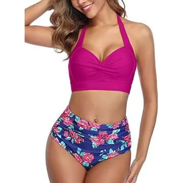 Tempt Me Women's Vintage Swimsuits Retro Halter Ruched High Waist Bikini with Bottom Rose Red M