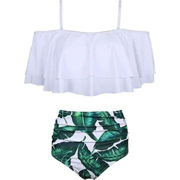 Tempt Me Women White Leaf Two Piece High Waisted Bikini Set Swimsuit Off Shoulder Ruffle Bathing Suits Tummy Control Ruched Swimwear M