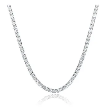 Show more The exquisite Tennis Necklace features an 18K white gold plated brass design that stands out for its shimmering beauty and exceptional durability. Crafted with an array of stunning 5A+ cubic zirconia stones, this 14-inch necklace is not only designed to add an airy elegance to your look but also to withstand the test of time. Each stone is securely held in place with a unique 4 prong setting, ensuring a brilliant sparkle that catches the light effortlessly as you move. Whether you're pairing it with casual wear or a formal outfit, this necklace enhances your ensemble with its dazzling charm and versatility.
