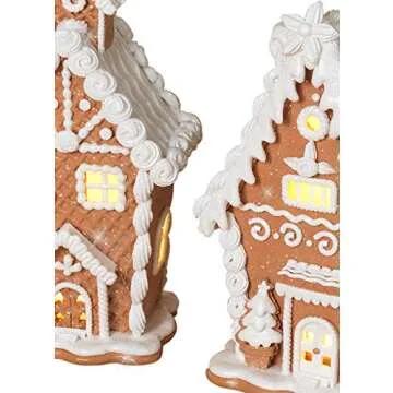 Show more Indulge in the whimsical charm of the TenWaterloo Set of 3 Lighted Gingerbread White Frosting Houses, a delightful addition to your holiday decor that captures the magic of Christmas. Crafted from a high-quality clay dough resin and beautifully finished with a sparkled snow effect, these gingerbread houses offer a lifelike appearance that transports you to a delightful winter wonderland. Each house stands an impressive 7.5 inches high, making them the perfect focal point for your mantle, kitchen counter, or festive table display. With intricate details that mimic real gingerbread craftsmanship, they create an enchanting festive scene, especially when illuminated from within. Ideal for bringing a touch of nostalgia and whimsy to your home this holiday season, these houses are sure to become a cherished part of your family's traditions.