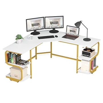 Show moreIntroducing the Teraves Modern L Shaped Desk with Shelves, a perfect blend of elegance and functionality, ideal for anyone seeking a comprehensive workspace solution. With its stylish White+Gold Frame design, this desk not only enhances your home office aesthetic but also brings organization and efficiency to your work area. This multi-functional piece serves as a computer desk, gaming desk, craft desk, or even a tool table—making it immensely versatile for all types of users. The expansive 64.84" x 21.65" desktop is tailored to hold multiple monitors, printers, books, and decorations, ensuring ample room to thrive in your projects.