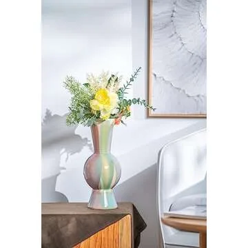 Introducing the TERESA'S COLLECTIONS 12.2 inch Tall Modern Ceramic Vase – an exquisite piece that seamlessly blends contemporary design with classic functionality. This artistic vase boasts a bubbly hourglass shape that captivates the eye and adds a funky yet fresh ambiance to any modern home decor. Its smooth finish complements its unique form, making it a standout piece in your interior space.