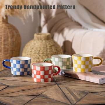 Show more Introducing the perfect addition to your kitchenware, the exquisite TERESA'S TEASET Coffee Mug Set. This vibrant set features 4 uniquely hand-painted mugs, each showcasing a delightful checkerboard pattern that is sure to brighten your day. Crafted from high-quality ceramic, these mugs are not just visually appealing but also safe for daily use as they are lead and cadmium-free. Whether it's for your morning coffee, evening tea, or a refreshing juice, these 10 oz mugs are versatile enough for all your beverage needs.
