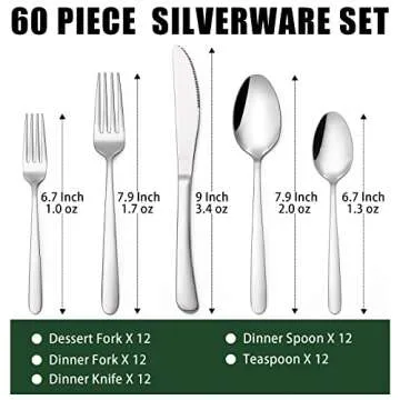 Introducing the ultimate silverware set designed to elevate your dining experience! The Terlulu 60-Piece Silverware Set is thoughtfully crafted for a service of 12, making it an ideal choice for families and anyone who enjoys hosting gatherings. Each set includes 12 dinner forks, dinner spoons, dinner knives, teaspoons, and salad/dessert forks, ensuring you have everything you need for any meal or gathering. The elegant and classic design of this set is versatile enough to...