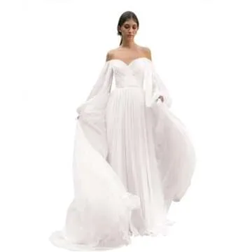 Show more Experience unparalleled elegance on your special day with the Ternlm Women's Off Shoulder Elegant Wedding Dress created specifically for brides who desire both beauty and comfort. This exquisite gown features a flattering pleated bodice that seamlessly transitions into gorgeous puffy long sleeves, finished off with a romantic off-shoulder design, perfect for showcasing your décolletage. Made from soft chiffon material, this dress is designed to glide gracefully as you move, ensuring that you feel as stunning as you look on your wedding day. The corset back allows for a customized fit, while the built-in bra offers added support, making it one of the most comfortable wedding dresses you’ll ever wear.