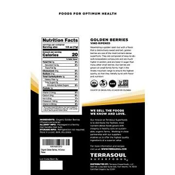 Show moreDiscover the delightful taste of Terrasoul Superfoods Organic Golden Berries in this 16-ounce pouch, a perfect addition to your healthy snacking routine. These dried golden berries are carefully dehydrated to a moisture level of approximately 15%, ensuring they retain their soft and chewy texture. Not only do they offer a satisfying snack experience, but they are also packed with nutrients, making them a guilt-free treat for any time of day.