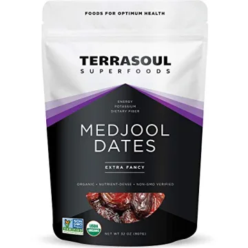 Show more Experience the divine taste and numerous health benefits of Terrasoul Superfoods Organic Medjool Dates in a generous 2-pound bag. Handpicked from organic farms in California, these dates are certified USDA Organic and Earth Kosher, truly representing a commitment to the finest quality. Each date promises a delightfully chewy texture and a rich, sweet flavor reminiscent of caramel candy, making them not just a snack but a gourmet experience.