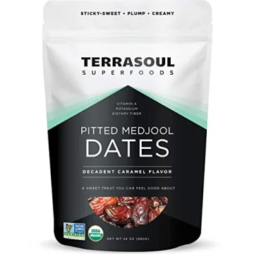 Show moreTerrasoul Superfoods brings you the finest Organic Pitted Medjool Dates, grown in the lush Coachella Valley of California. These dates are not just any ordinary snack; they are a testament to nature's sweetness, certified organically grown, glyphosate-free, gluten-free, and certified kosher. Each date is carefully pitted to ensure a hassle-free eating experience, offering a soft, chewy texture with a rich caramel taste that's irresistibly delicious. Whether you're looking for a healthy snack, a natural sweetener for your recipes, or a nutritious addition to your diet, these Medjool dates are a perfect choice.