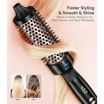 With a well-thought-out combination of advanced materials and user-friendly features, this thermal brush provides 4X less damage and frizz compared to traditional curling methods. Infused with argan oil, keratin, and tourmaline, the brush emits negative ions while it heats up, locking in moisture for silky-smooth results. Enjoy the versatility of even heat distribution that ensures your hair stays healthy and vibrant, avoiding the potential pitfalls of conventional styling tools that lead to dryness and split ends.