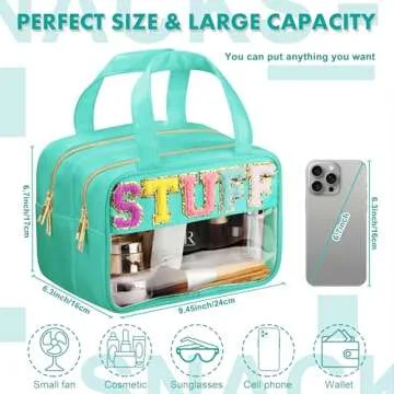 TESAFNG Chenille Letter Travel Makeup Bag, Preppy Patch Nylon Clear Cosmetic Tote with Handle and Zipper, Waterproof Large Snack & Stuff Bag Toiletry Storage Pouch for Women Girls (Green-Stuff)