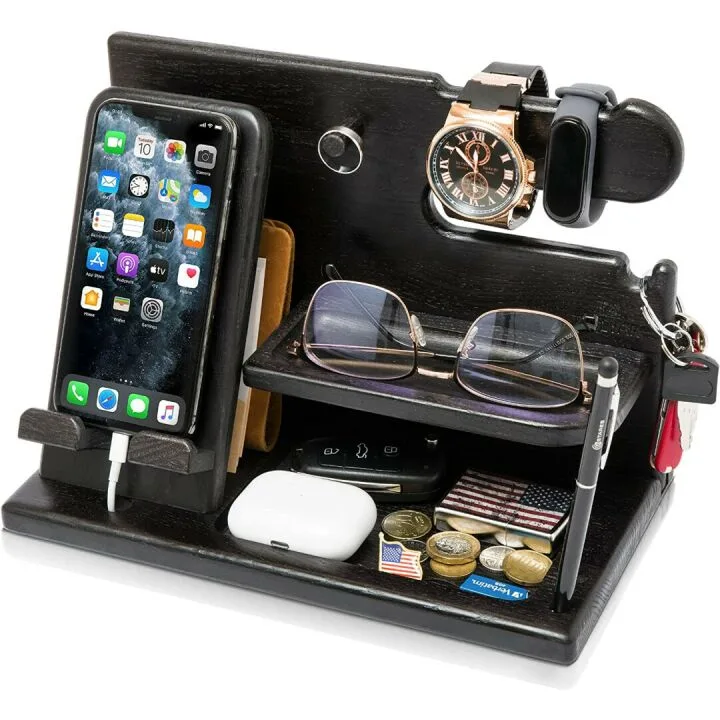 This stand is designed with simplicity in mind. It is easy to assemble, with an assembly manual included. The stand is compatible with all smartphone models and includes sections for stationery, wallets, paperwork, glasses, watches, fitness trackers, bracelets, and other items.IDEAL GIFT
