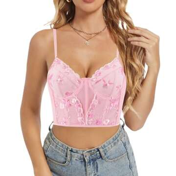 Testudineus Women Chic Floral Embroidered Corset Top Spaghetti Strap Sheer Mesh Push Up Bustier Bralette