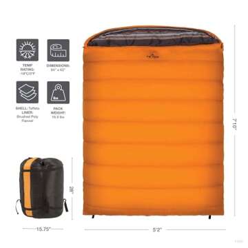 Show moreThe TETON Mammoth 0 Degree Sleeping Bag is the epitome of luxury and warmth for outdoor sleeping. Tailored for families who cherish shared camping experiences, this double sleeping bag offers an immense space of 94x62 inches (239x157 cm), making it larger than a queen-sized mattress. Crafted with a plush poly-flannel lining, it invites you to envelop yourself in comfort after a long day of adventures. The unique design features dual-layer construction that ensures not just warmth, but a cozy atmosphere for you and your loved ones. Whether you're stargazing or snuggling up next to the campfire, this bag makes every moment unforgettable.