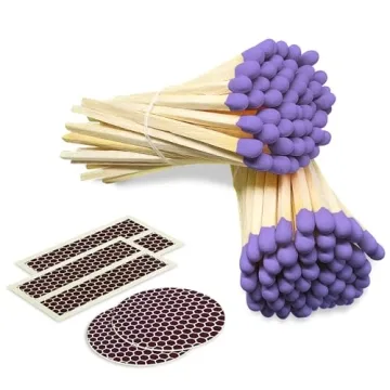 Show more Introducing the **Thankful Greetings 4" Lilac Matches** - a delightful enhancement to any home décor or special event! These unique safety matches come in a striking lilac color and are designed not only to serve their purpose but also to elevate the aesthetic of your space. Measuring approximately 4 inches in length, each of the **100 high-quality matches** is crafted from durable wood, ensuring safe and reliable lighting for all your favorite candles. Plus, they come complete with a large bumble striker sticker and two smaller ones, allowing for seamless lighting wherever you need it.