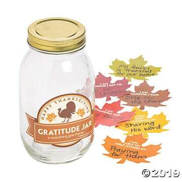 This mason jar can be filled with colorful leaves that include prompts like "I Am Thankful For" and "I Show God I'm Thankful By."