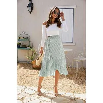 ThCreasa Womens Boho Floral Print High Waisted Wrap Skirts Ruffle Hem Tie Knot Summer Chiffon Flowy Midi Skirts Green M