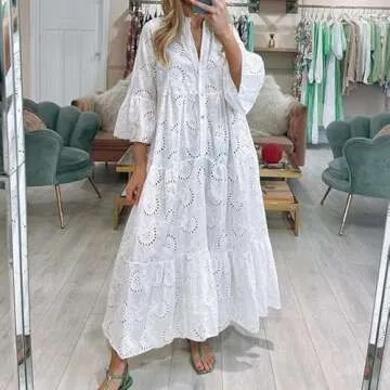 ThCreasa Womens V Neck Eyelet Embroidery Maxi Dresses Lace 3/4 Trumpet Sleeve Button Hollow Tiered Swing Long Dress White XS