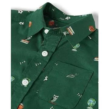 This shirt features short sleeves and a pointed collar, adding a touch of sophistication to your child's ensemble. The chest pocket provides a fun detail, while the curved shirttail hem ensures a comfortable fit that allows for maximum movement. With an allover school supplies print, it's not just stylish but also educationally themed, making learning visually appealing!