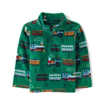 Show moreIntroducing the Baby Toddler Boys Warm Fleece Quarter Zip Pullover from The Children's Place, the ideal blend of warmth, style, and comfort for your little explorer! Crafted from a premium blend of 76% polyester and 24% recycled polyester microfleece, this pullover not only feels luxurious against your child's skin but also promotes sustainability with its recycled materials. Designed for the adventurous toddler, it features a mock neck and long sleeves to provide optimal warmth during chilly days, while the playful green train print adds a fun, vibrant touch that your little one will love. The half-zip front ensures easy dressing and undressing, making mornings a breeze.