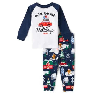 Show moreExperience the joy of holiday comfort with the stunning pajama set from The Children's Place, crafted from 100% cotton jersey for ultimate softness. Designed with meticulous attention to detail, the top features a charming 'Home for the Holidays' car graphic, emphasized by its crew neck and raglan long sleeves for increased comfort and mobility. The accompanying pajama pants come with a convenient pull-on elasticized waistband and banded leg cuffs, ensuring a snug fit while allowing for easy wear. The fun holiday car print adds a whimsical touch to bedtime routines, making these pajamas a festive addition to any child's wardrobe.