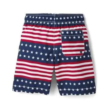 Featuring a practical pull-on elasticized waistband with a functional drawstring, these swim trunks offer a snug fit that won’t budge even during the most energetic activities. The back patch pocket is perfect for holding little treasures, while the side vents at the hem allow for freedom of movement. Adorned with an allover American stars and stripes print, these trunks are not just functional but also incredibly stylish; they can easily be paired with a rashguard and flip flops for a complete summer ensemble.