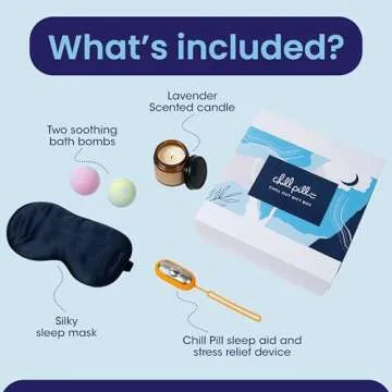 Show moreThe Chill Pill Chill & Unwind Gift Box is the ultimate self-care experience crafted for those who value tranquility and relaxation. This thoughtfully curated set not only serves as a pampering indulgence on a cozy spa night at home but also stands out as a considerate gift for loved ones in need of stress relief. Within this elegant box, you will find two soothing bath bombs infused with aromatherapy, a beautifully scented candle, a luxurious silky sleep mask, and the innovative Chill Pill sleep aid device. This ensemble promotes an atmosphere of peace and encourages better sleep, making it an ideal choice for anyone looking to prioritize personal wellness.