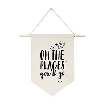 Show moreTransform your little one's nursery into a whimsical haven with the enchanting The Cotton & Canvas Co. Oh the Places You'll Go Hanging Wall Canvas Banner. Crafted from premium 100% Cotton Canvas, this beautifully printed banner features the famous quote from Dr. Seuss, making it a delightful addition to any child’s room. Measuring at a perfectly compact 14" H x 10" W, it fits splendidly in small or large spaces alike, bringing a touch of inspiration and joy to your child's daily environment. Made in the USA, this high-quality piece marries durability with charm, ensuring it remains a treasured decor item for years to come.