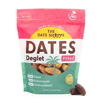 Show moreIntroducing The Date Shoppe Pitted Deglet Dates – the ultimate healthy snack option that will indulge your taste buds and nourish your body! Grown in the serene landscapes of So-Cal's Coachella Valley, these dates are more than just a sweet treat; they are a nutrient-packed powerhouse. Known as Medjool's nuttier cousin, Deglet Dates boast a firmer texture paired with a unique, buttery flavor profile that enhances everything from baked goods to smoothies. Our resealable 2-pound bag ensures freshness and convenience, making it easy to enjoy these gluten-free, vegan, and paleo-friendly delights anytime, anywhere. You can indulge in their subtly sweet, caramelly taste without compromise, thanks to our commitment to no added sugar and non-GMO sourcing.