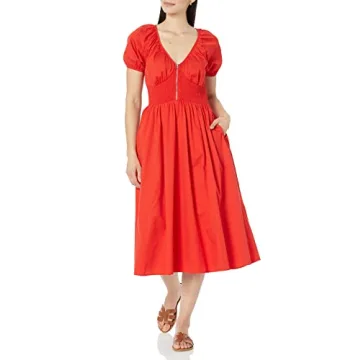 Show moreIntroducing the Staples by The Drop Women's Daksha Cotton Smocked Zipper Detail Dress, your perfect companion for effortless style and comfort! Crafted from an airy cotton sateen, this stunning dress features a smocked bodice that adapitates to your figure for a flattering fit. The eye-catching flame red color will make you stand out in any crowd, and the front zipper design adds a touch of practicality, making nursing and dressing a breeze. With a length of 48" in size XXL, this dress gracefully falls to the mid-calf, offering a balanced silhouette that's versatile enough for both casual outings and special occasions.