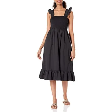 Introducing the Staples by The Drop Women's Kimi Ruffled Shoulder Smocked Midi Dress, an essential addition to your wardrobe designed to elevate your style with ease. This dress features a chic ruffled shoulder detail that adds a touch of femininity while the smocked bodice offers a flattering fit for various body types. Available in a classic black hue, it promises to be versatile, effortlessly transitioning from casual daytime outings to elegant evening events. At a comfortable length of...