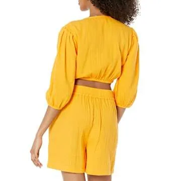 The Drop Women's Natasha Gauze Cropped Tie-Front Puff Sleeve Top