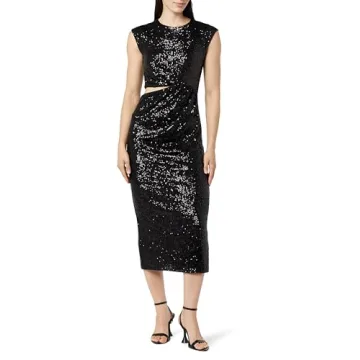 Elevate your fashion game with The Drop Women's Padma Cutout Sequin Midi Dress. This stunning black midi dress is more than just a piece of clothing; it’s a statement of elegance and sophistication. Crafted from high-quality materials, this dress features exquisite sequin detailing that shimmers with every movement, making it perfect for special occasions. The unique cutout design adds a modern twist, ensuring you stand out in any crowd. Designed with a flattering silhouette, the Padma...