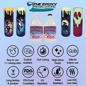 Show more Introducing The Epoxt Resin Store Tumbler Coating Epoxy Resin, your ultimate solution for achieving a stunning glossy finish on your tumblers and crafts. This premium two-part epoxy resin kit is designed to cure quickly within just 12 hours, allowing you to get back to your projects faster than ever. With its high gloss finish, your tumblers will sparkle and shine, enhancing their overall aesthetic appeal while providing a durable protective layer.