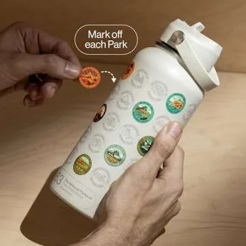 THE GEOPROJECT National Parks Water Bottle with Stickers Kit, Erikas Chesonis Collaboration, Adventure Flask with Straw, Waterproof Stickers for Water Bottle, Insulated Stainless Steel 32oz (Tan)