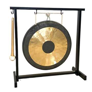 Show more Transform your space with the mesmerizing soundscape of the 12” Chau Gong from The Gong Shop. Every stroke of this expertly handcrafted percussion instrument unveils a world of soothing vibrations and spiritual connections. With more than 16 years of artisan craftsmanship behind it, this gong transcends being merely a musical tool; it is a striking symbol of culture and artistry, meticulously produced in China. Its stunning visuals, complemented by its shimmering wash finish, make it a captivating centerpiece for any home or meditation area.