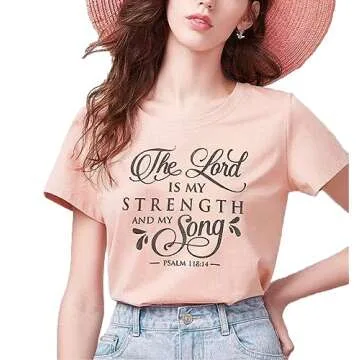 Show moreIntroducing the The Lord is My Strength and My Song T-Shirt, a delightful addition to any woman’s wardrobe this summer. Crafted from a premium blend of 80% natural cotton and 20% spandex, this tee offers unmatched comfort with a soft, breathable touch against your skin, ensuring you stay cool and fresh throughout the day. The whimsical letter print, featuring the uplifting quote, "The Lord is my strength and my song,” adds a charming touch, making it an ideal choice for those who appreciate faith-inspired fashion. The classic crew neck and short sleeves make it versatile for various styles and occasions, whether you’re dressing it up or down.