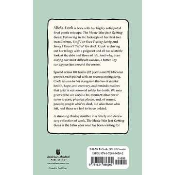 Show moreThe Music Was Just Getting Good by Alicia Cook is a masterful and poignant conclusion to her beloved Mixtape Series. This final installment takes readers on an emotive journey through the intricacies of grief, loss, and the bittersweet nature of life. With her characteristic sharpened insight, Cook captures the delicate balance between sadness and hope, demonstrating her ability to connect deeply with her audience. Each poem is crafted with care, exploring themes that resonate with anyone who has experienced deep emotional turmoil.