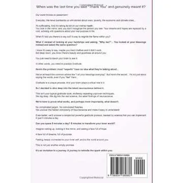 Show moreDiscover the profound impact of gratitude on your mental well-being with "The Neuroscience Of Gratitude: Why Self Help Has It All Wrong." This transformative guide offers a revolutionary five-minute daily practice designed to rewire your brain for positivity and happiness. Backed by scientific research, this book uncovers the mechanisms of gratitude and its ability to enhance your emotional state. Ideal for anyone seeking genuine happiness, this comprehensive resource equips you with the tools needed to cultivate a powerful gratitude practice and incorporate it into your daily life.