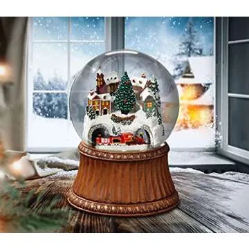 Constructed with a sturdy resin base featuring a gorgeous faux wood finish, this collectible snow globe not only aims to delight the viewers but also complements your holiday displays flawlessly. Its classic built-in mechanical music player plays the beloved holiday carol “Silver Bells” upon winding up, making it a piece that delights not just visually, but audibly as well. This snow globe truly embodies the joy and wonder of the Christmas season, making it a perfect keepsake for years to come.