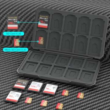 Show moreIntroducing the THELIFELICIOUS SD Card Holder Memory Card Case, your ultimate solution for organizing and protecting your precious data. Designed to accommodate up to 20 SD cards and an equal number of micro SD cards, this storage organizer is ideal for photographers, videographers, and tech enthusiasts who require a reliable and stylish way to keep their memory cards safe. The case boasts a robust ABS exterior and soft silicone interiors that offer excellent durability, ensuring your cards remain unharmed even during travel.