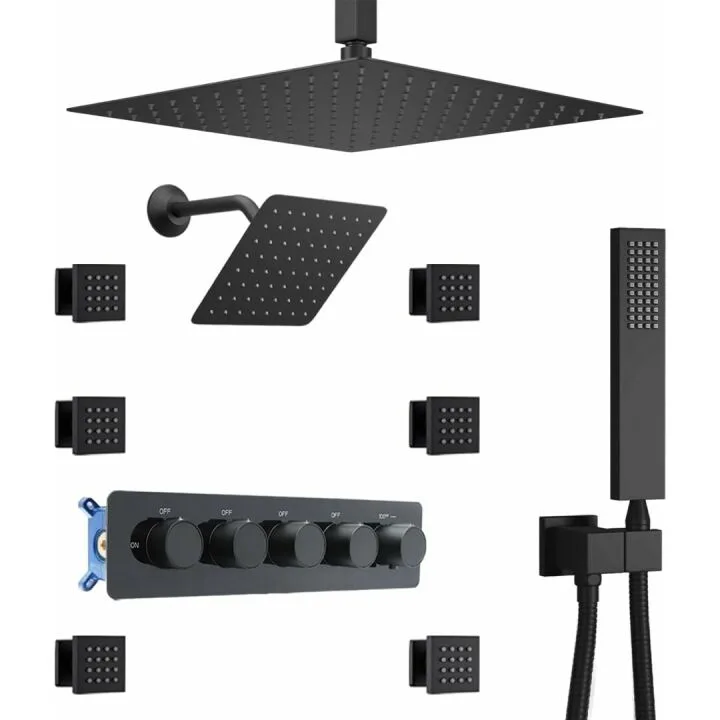 Show moreThe NPYSVSSS Thermostatic Shower System is an exceptional addition to any bathroom, combining luxury and practicality in one seamless design. This high-end shower system features dual shower heads for a comprehensive shower experience. The package includes a 16 inch ceiling-mounted rain shower head and an 8 inch wall-mounted head, offering four distinct functions for a full-body, immersive shower. The matte black finish adds a modern touch, making it a stunning centerpiece in any bathroom decor. Constructed from premium materials, this thermostatic shower system ensures durability and long-lasting performance. The thermostatic valve provides precise temperature control, ensuring a safe and comfortable shower experience. Customers have praised its easy installation, stylish look, and the ultimate relaxation it delivers.