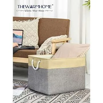 Show more Introducing the TheWarmHome Fabric Storage Basket, your new ally in achieving a clutter-free and stylish home! Designed with both form and function in mind, this extra jumbo storage bin measures 20.5 inches in length, 15.7 inches in width, and 13.8 inches in height, making it perfect for a multitude of storage needs. Whether it’s clothes, towels, toys, or office supplies, this decorative piece is not just a practical storage solution but a charming addition to your home decor. The elegant gold and grey color scheme beautifully complements any setting while the drawstring top ensures that your belongings remain dust-free and neatly stowed away. Say goodbye to chaos and hello to organized elegance with TheWarmHome Storage Basket! Less