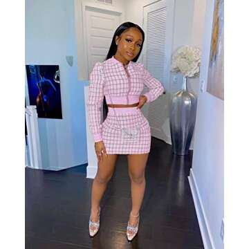 Show moreElevate your wardrobe with the THLAI Women 2 Piece Skirt Set, a stunning ensemble that perfectly combines style and comfort. This fashionable two-piece tracksuit includes a chic zip-up jacket and a stylish bodycon mini skirt, designed for the modern woman who values both aesthetics and practicality. Crafted from a soft blend of polyester and spandex, this outfit offers a luxurious feel against your skin while maintaining a flexible fit that moves with you. The vibrant pink color and eye-catching plaid pattern enhance its visual appeal, making it an ideal choice for various occasions.