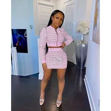Show more Elevate your wardrobe with the THLAI Women 2 Piece Skirt Set, a stunning ensemble that perfectly combines style and comfort. This fashionable two-piece tracksuit includes a chic zip-up jacket and a stylish bodycon mini skirt, designed for the modern woman who values both aesthetics and practicality. Crafted from a soft blend of polyester and spandex, this outfit offers a luxurious feel against your skin while maintaining a flexible fit that moves with you. The vibrant pink color and eye-catching plaid pattern enhance its visual appeal, making it an ideal choice for various occasions.
