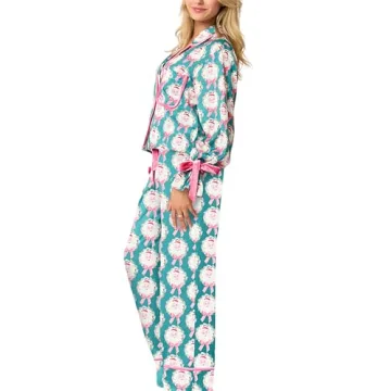 Show more Indulge in comfort and style with our exquisite Women Cute Christmas Pajamas Set, crafted with care from 100% Polyester fabric. This pajama set is not just about looks; it’s designed to offer a smooth, soft, and lightweight experience, perfect for cozy nights at home or festive gatherings with friends and family. With its vibrant colors and charming cartoon prints, this set features a bow tie front long sleeve top that pairs delightfully with high waist wide-leg pants, creating an effortlessly chic ensemble.