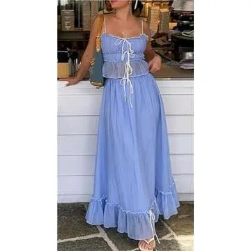 Thopavenoir Women Y2k 2 Piece Outfits Patchwork Front Tie-Up Camisoles and Ruched Ruffle Maxi Skirt Matching Set Beachwear (Blue, L)