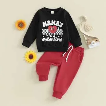 The top of the outfit showcases a cute ‘Mama's Valentine’s Day’ graphic coupled with a lovely plaid print, paired with neat solid color pants. This combination of visual elements makes it both stylish and lovable! From playdates to special occasions, your baby will not only look cute but feel comfortable all day long.