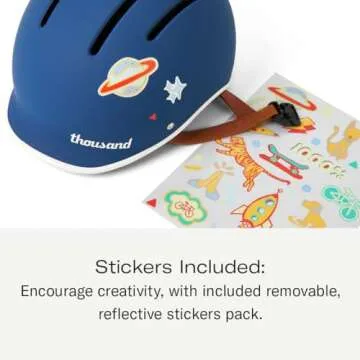 Show more Introducing the Thousand Kids Helmet, a perfect blend of safety, style, and creativity designed specifically for young adventurers. Featuring a unique capability for personalization, each helmet comes with a delightful pack of removable, reflective stickers, allowing your child to express their individuality while staying safe. The design not only prioritizes safety with its certified specifications for biking, roller skating, and skateboarding, but it also emphasizes comfort and adjustability. The adjustable dial fit system caters perfectly to growing heads, accommodating a head circumference of 49-53cm, thus ensuring prolonged use for years to come.